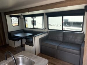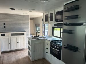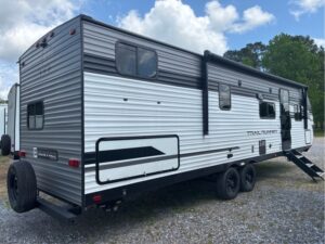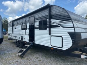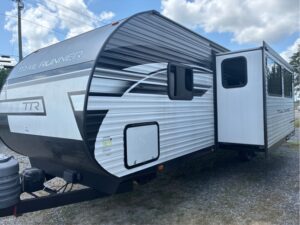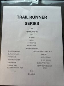 This 2024 TrailRunner by Heartland RV has ALL the room anyone could want! A total of 35′ long and weighs 6590lbs. There is a walk around Queen Bed with storage above, left, right, and under the bed. It has a BIG super slide with a fold out sofa and a large U shaped dinette that makes a bed. A kitchen with all the comforts of home. A Big SS refer, 3 burner gas stove with oven, L shape counter and double sink with high rise faucet so you can wash all those large pots and pans. A stand up shower or tub, with a vanity and a foot flush toilet. Then you have a hall storage drawers and a pantry. Man that’s a mouth full already, BUT THERE IS MORE!! Then you walk into the back bedroom and there is another entertainment center with storage. A second dinette for lunch, games, or study!! There is a fold up bunk above that if your kidos has a friend to come stay with yall. Plus 2 complete large bunks against the other wall. WHAT ELSE COULD YOU WANT OR NEED? So some check this unit out before it’s gone and you miss your opportunity at it. Because IT’S NOT GONNA STAY LONG!!!!